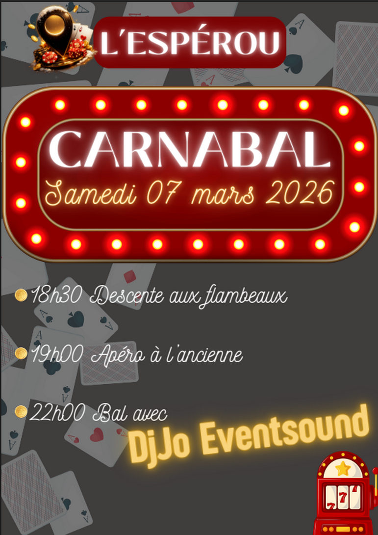 L'association "Espérou by night" vous invite à leur traditionnel Carnabal, le samedi 7 mars. Descente aux flambeaux à 18h30, apéritif à l'ancienne à 19h, bal gratuit avec DJ Jo Eventsound, thème Casino.