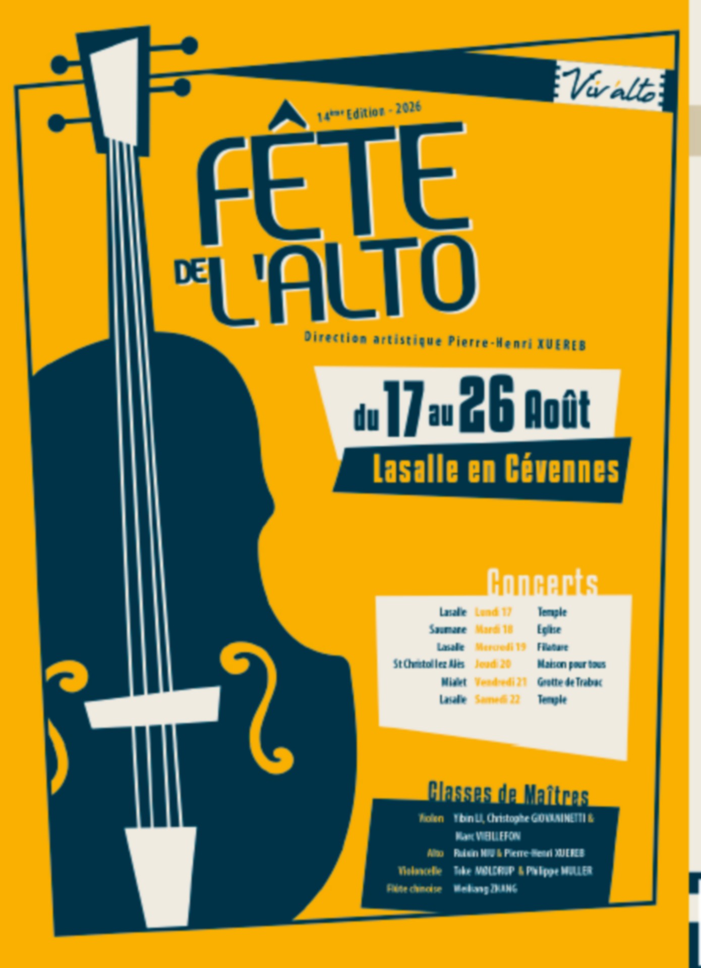 Viv'alto présente la 14ème édition de la Fête de l'Alto, un festival de concerts en itinérances dans différentes communes des Cévennes. Les concerts & classes de maîtres auront lieu cette année à Lasalle, Saumane, St Christol les Alès et Mialet.