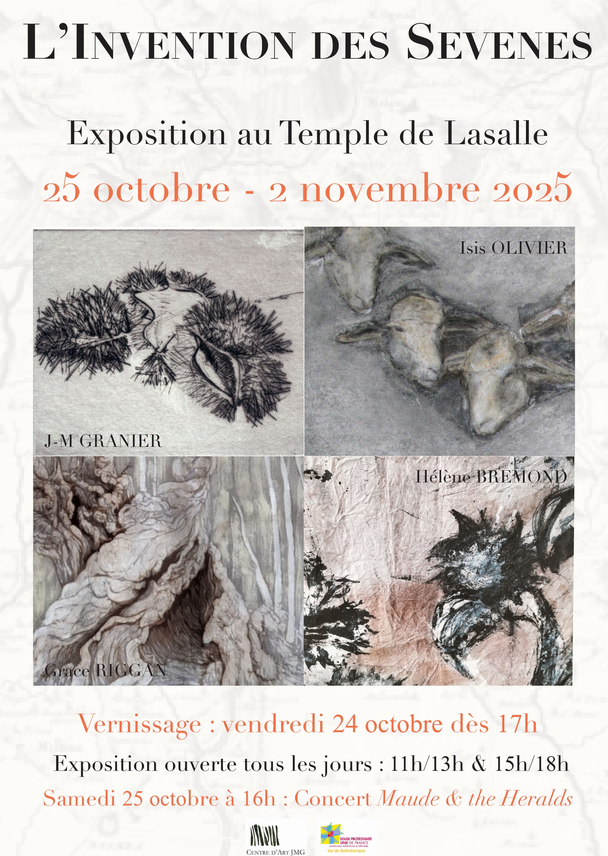 Isis Olivier, J-M Granier, Grace Riggan et Hélène bremond vous invitent à découvrir leurs œuvres exposés au temple du village. Un vernissage et un concert de "Maude & the Heralds" seront proposés dans le cadre de cette exposition.