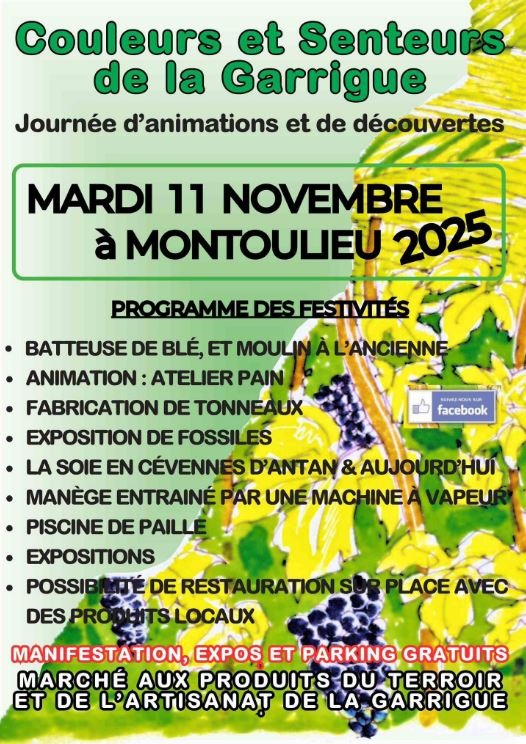 Chaque année le 11 novembre à Montoulieu la journée Couleurs et Senteurs de la Garrigue, une journée d'animation et de découvertes de la Garrigues,des produits du terroir avec plus de 70 agriculteurs et artisans présentant leurs produits.