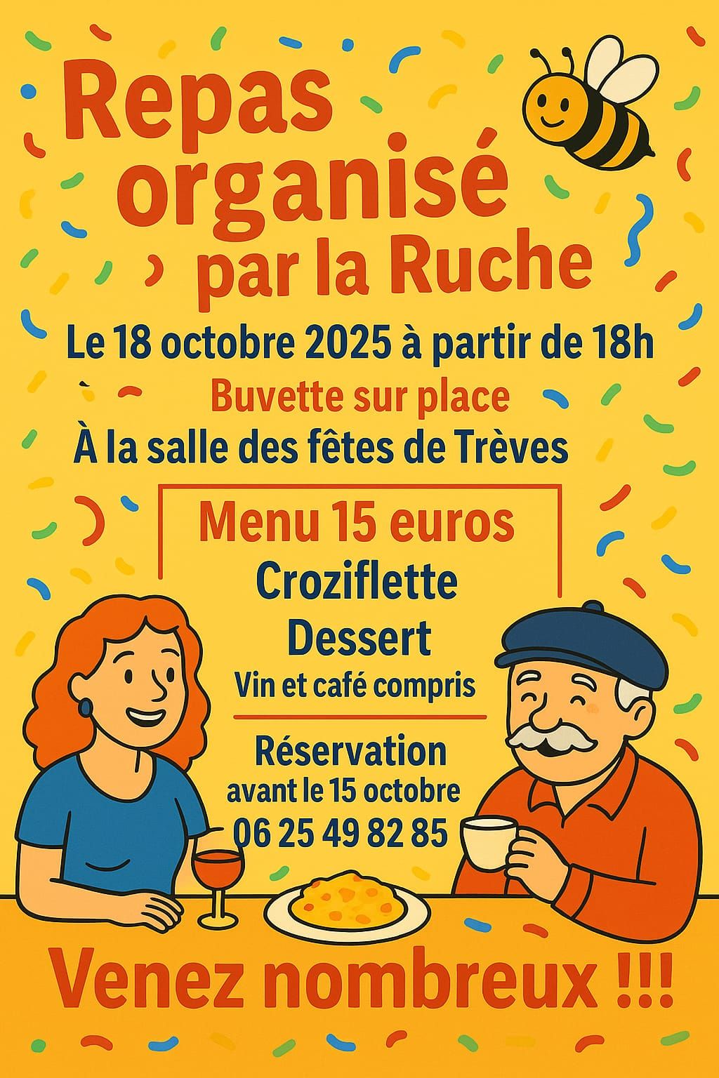 Nous vous attendons nombreux au repas organisé par "La ruche" à partir de 18h à la salle des fêtes.