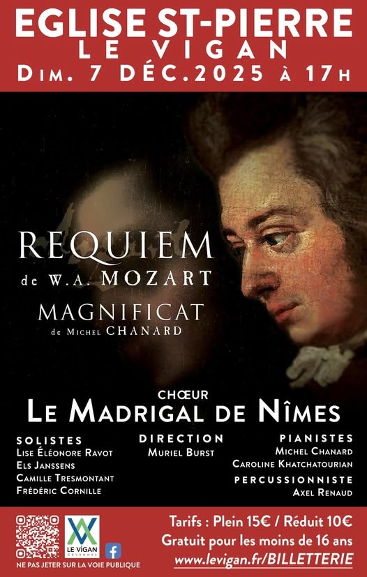 Le Madrigal de Nîmes se produira à l'église Saint Pierre pour un ultime concert consacré aux œuvres suivantes : le Magnificat de Michel CHANARD, pianiste du Madrigal depuis toujours, Magnificat spécialement composé pour le Madrigal, qui vaut la peine d'être découvert, et le fameux Requiem de MOZART.
