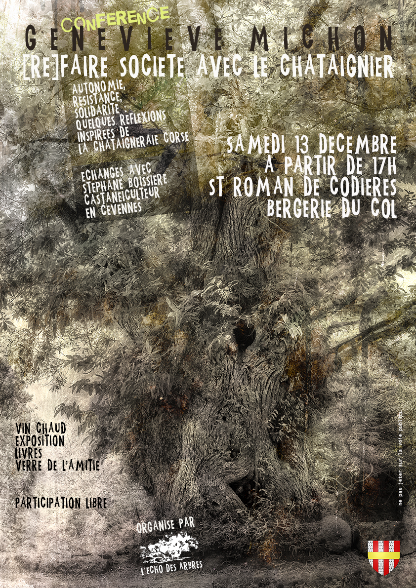 Cette conférence de Geneviève Michon, organisée par l'association l'Echo des Arbres, présentera quelques réflexions inspirées de la châtaigneraie corse : autonomie, résistance, solidarité. Les échanges avec Stéphane Boissière y donneront une vision locale.
