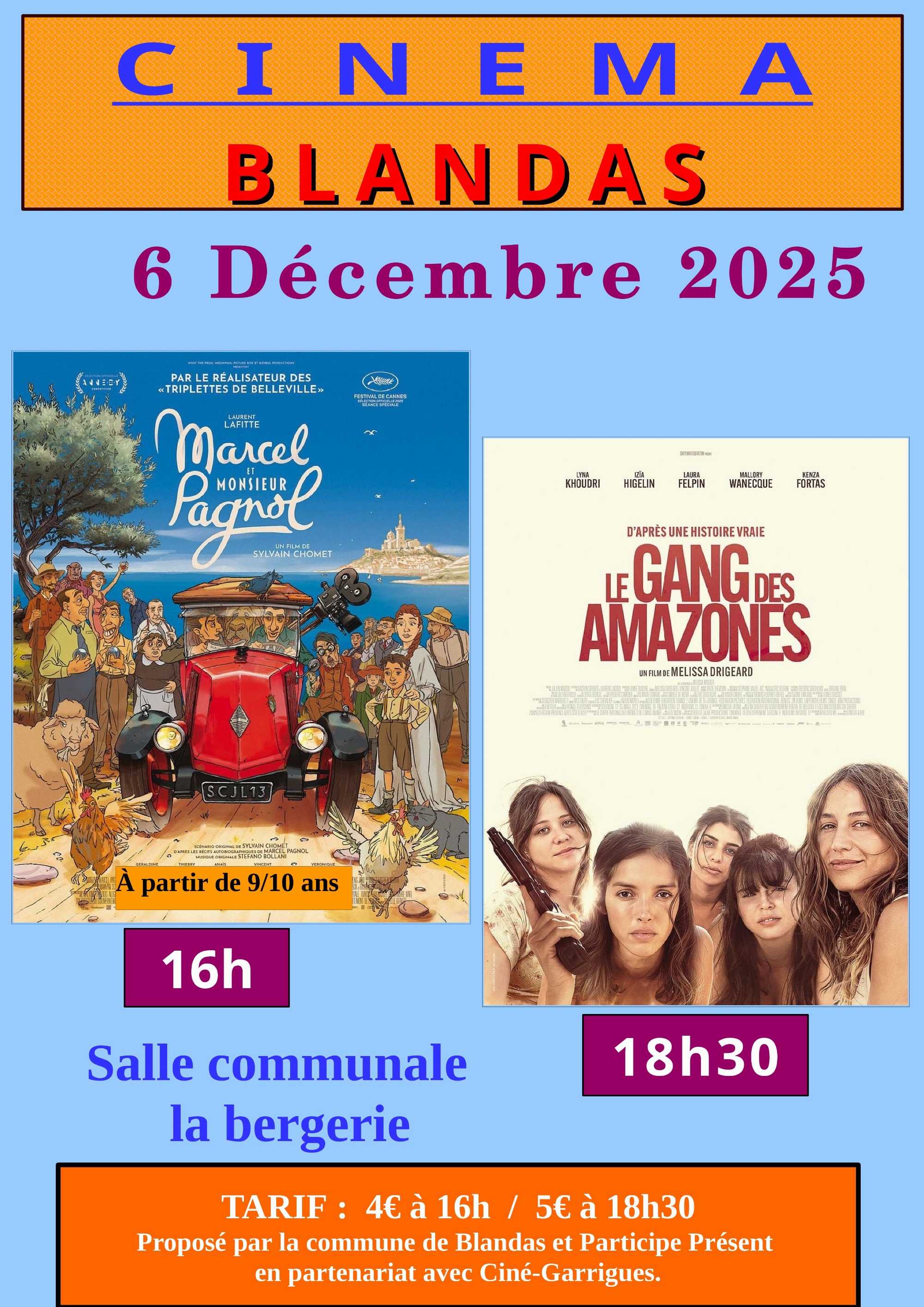 Séance Tout public à 16 h : Projection du film Marcel et Monsieur Pagnol - Entrée 4€ Séance pour adultes à 18h30 : Projection du film Le Gang des amazones -Entrée 5€