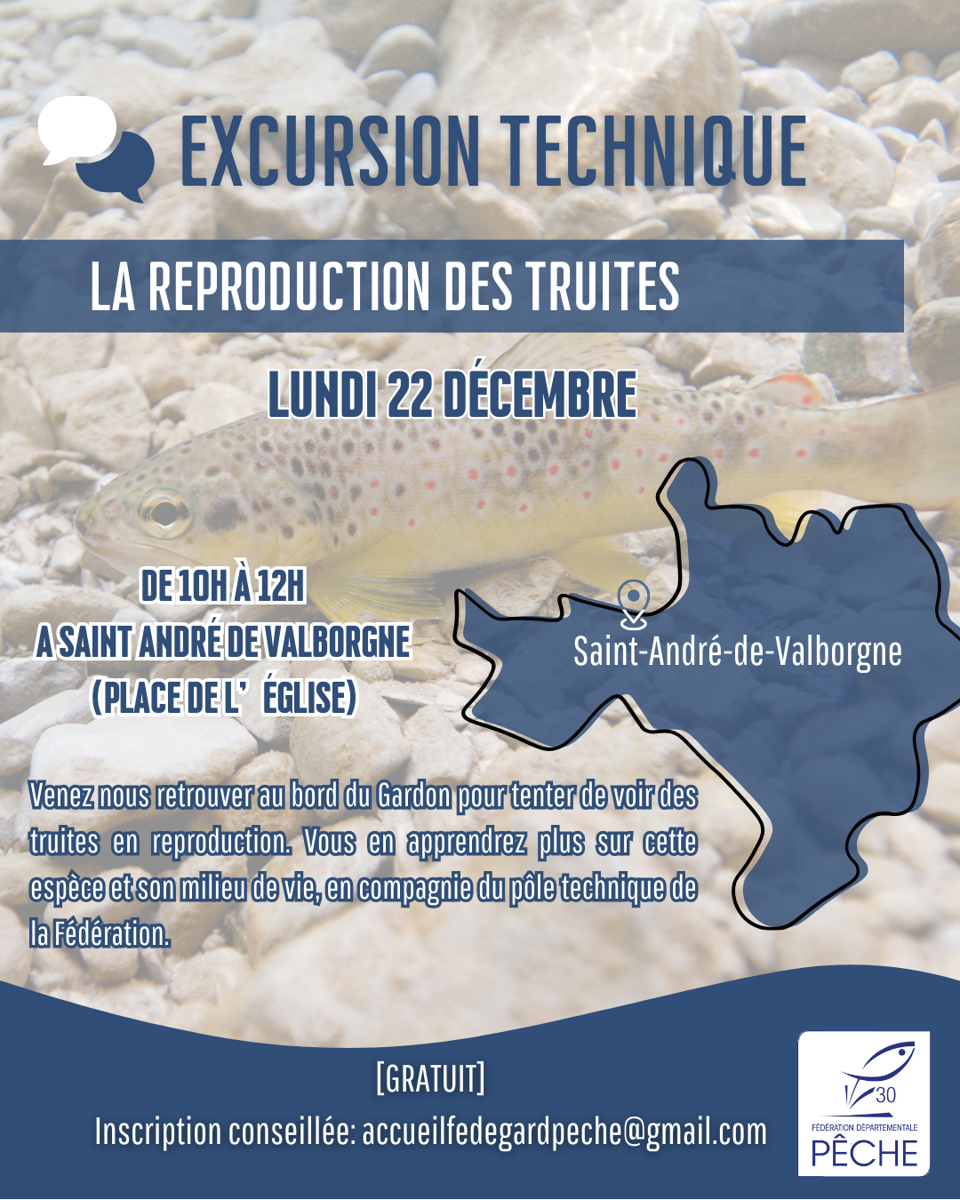Cette excursion vous expliquera comment reconnaitre un secteur favorable à la reproduction des truites, vous présentera l'espèce et son cycle biologique.