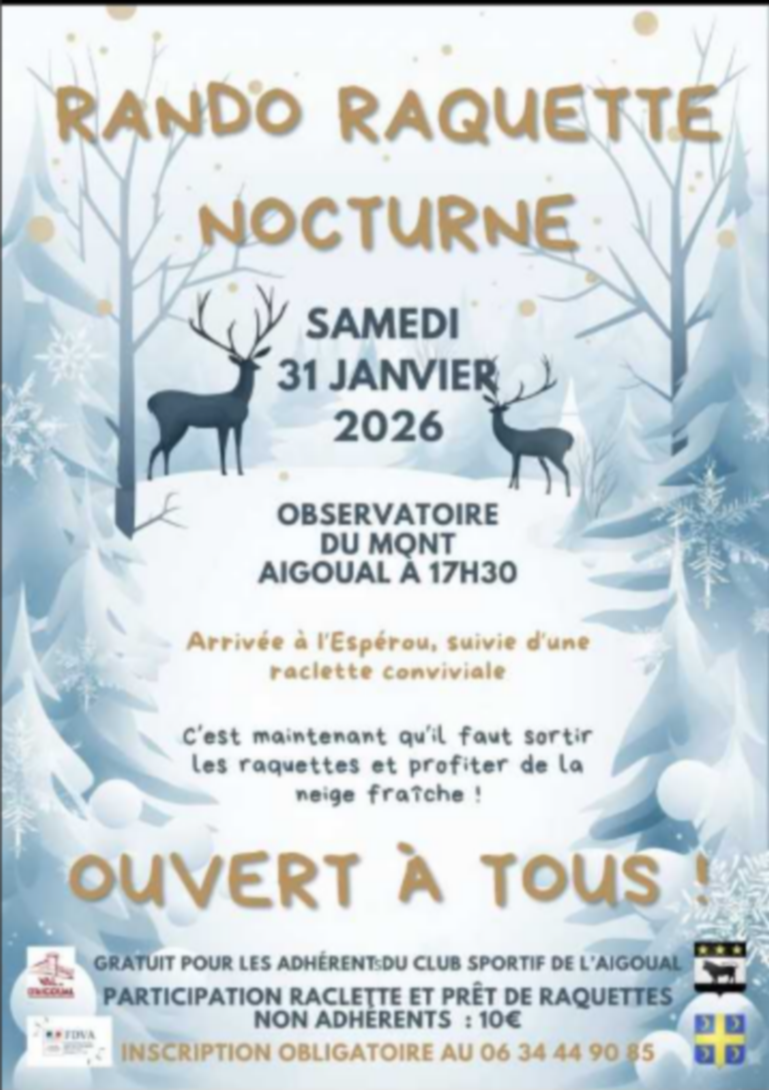 Rando raquettes à neige en nocturne au départ du sommet de l'Aigoual à 17h30 , arrivée à l'Espérou suivie d'une raclette conviviale. Ouvert à tous
