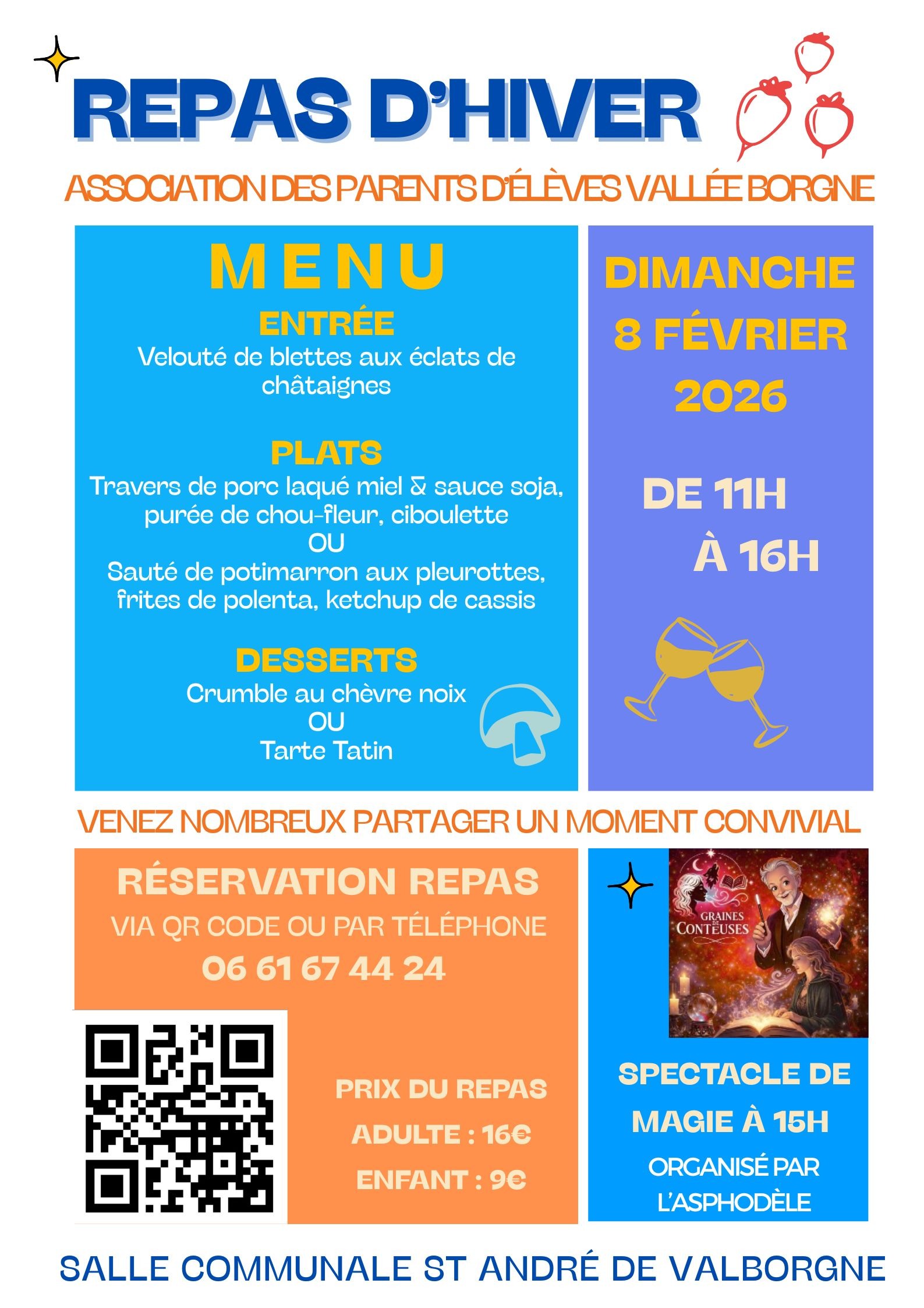 Venez vous régalez les papilles autour d'un repas convivial organisé par l'APE ! Le repas sera suivi d'un spectacle de contes avec magie, organisé par l'ass Asphodèle et Graines de Conteuses (au chapeau).