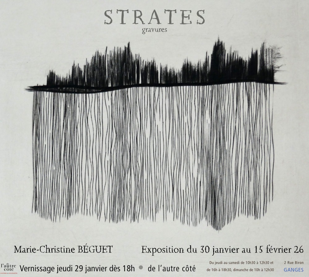 Mes gravures au burin sont inspirées de dessins à l’encre issus de mes carnets. Les lignes tirées à la plume et au pinceau s’étalent au contact de l’eau provoquant des flous indéterminés. Elles inspirent de grands formats et des structures suspendues – strates de papier – à l’encre et xylogravure sur un papier fin et fragile destiné à la calligraphie.