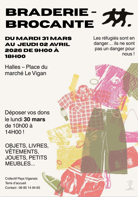 l'association apavia collectif pays viganais terre d'accueil installe sa braderie aux halles du vigan du 31 mars au 2 avril 2026 au bénéfice des personnes exilées au vigan et communes alentour.