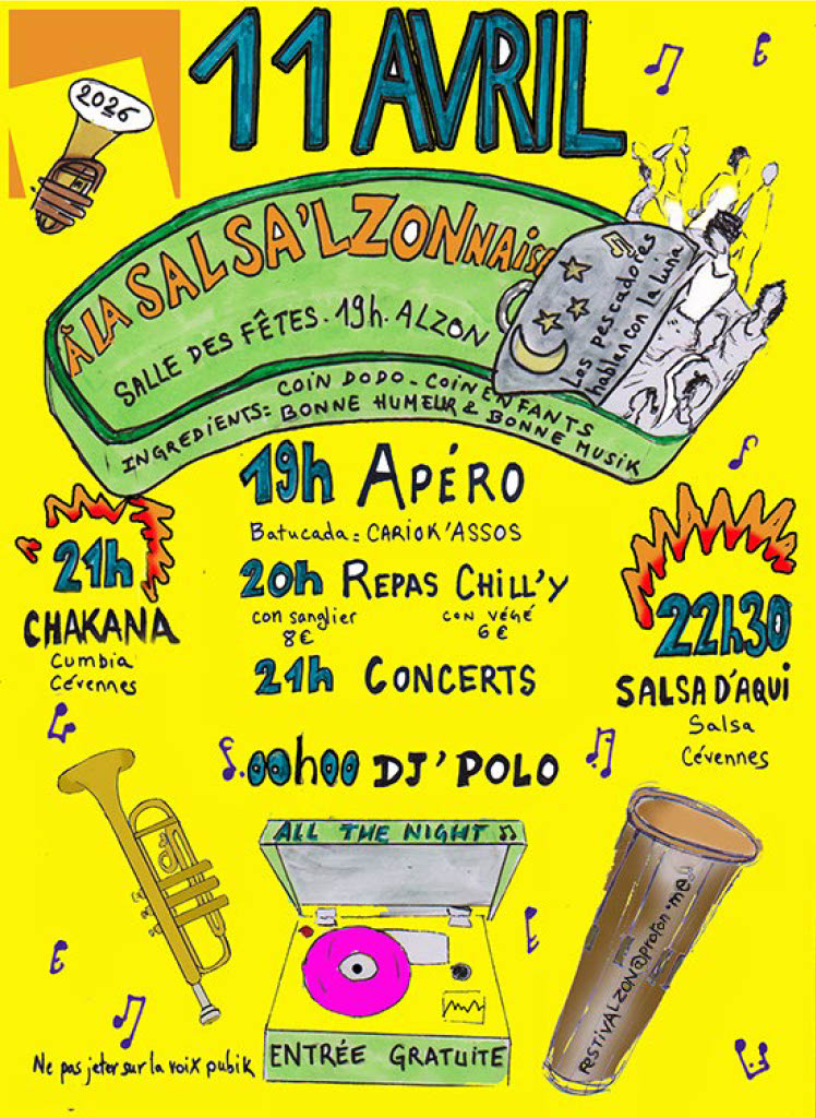 Le 11 Avril à partir de 19h: Apéro avec la batucada Cariok'Assos, 20h: repas, 21h: Concerts avec Chakana (Cumbia) et Salsa d'Aqui (Salsa); 00h: Dj Polo. Coin enfants, coin dodo