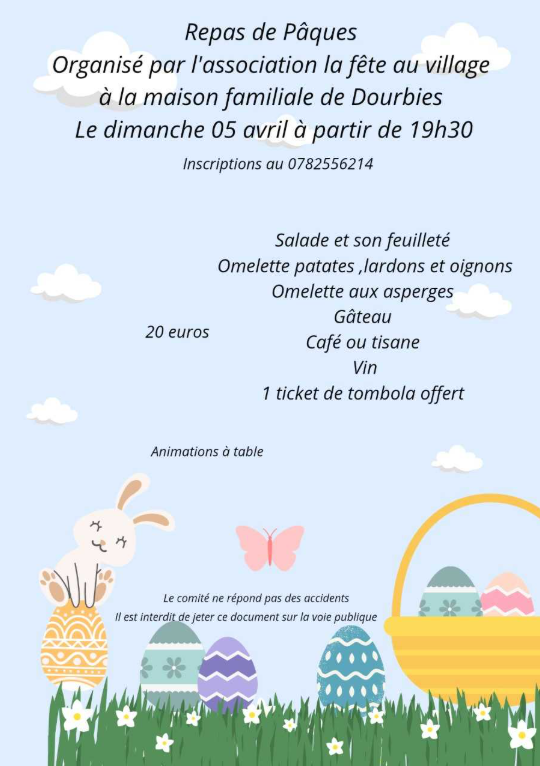 Repas de Pâques à la maison familiale de Dourbies à partir de 19h30.