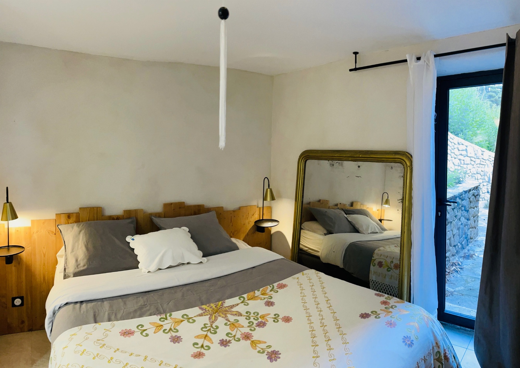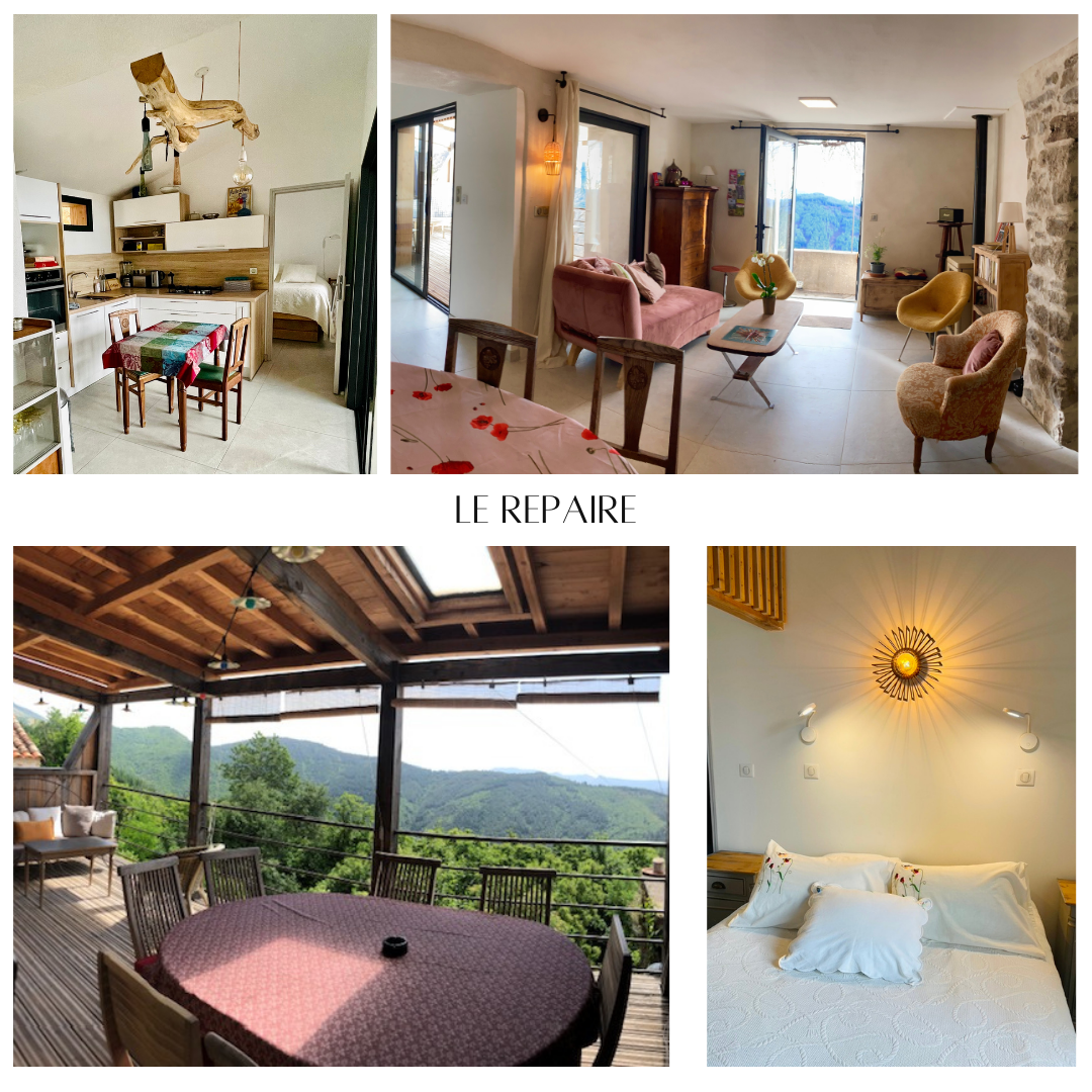 Le Repaire dispose de 3 chambres élégantes (dont une avec une mezzanine pour accueillir 2 personnes supplémentaires). Chacune dispose de sa propre salle d’eau. La pièce de vie, chaleureuse et lumineuse, comprend une cuisine toute équipée. Elle s'ouvre sur une belle terrasse couverte avec une vue exceptionnelle sur les Cévennes.