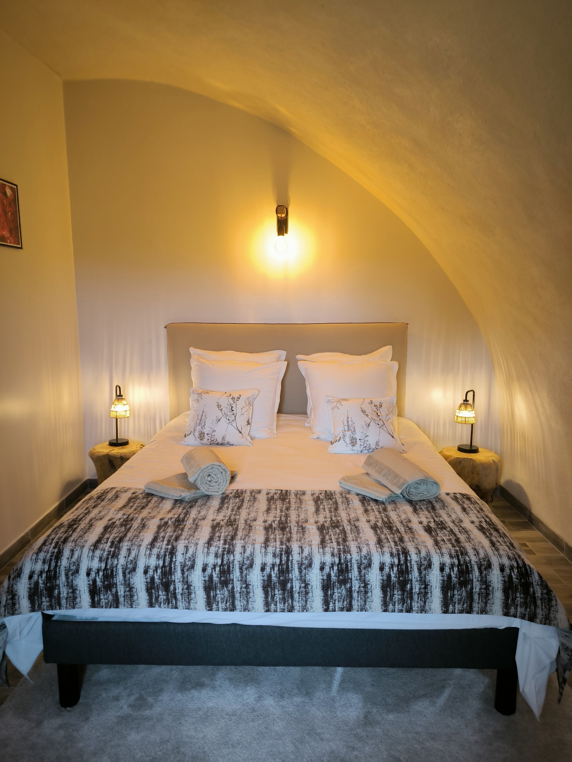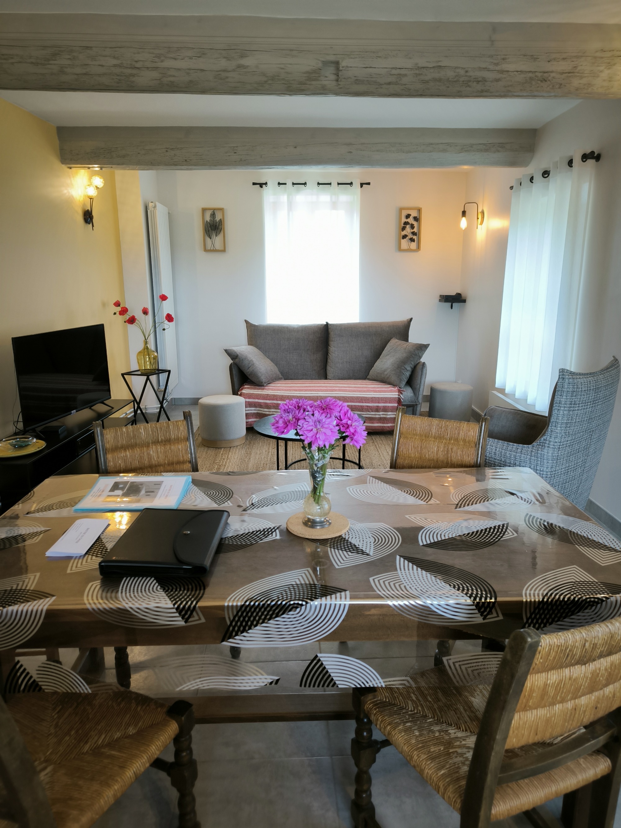 Le gîte comprend : 1 grande pièce à vivre avec coin cuisine (équipé de l’ensemble de l’électroménager moderne) et salon (canapé convertible en lit 140) ; 1 chambre avec 1 lit 160 ; 1 chambre avec 2 lits 90 (modulables en lit 180) ; salle de bain et WC indépendant ; 1 terrasse privative avec mobilier de jardin et barbecue ; 1 abri vélos ; recharge voiture et vélo électriques possible.
