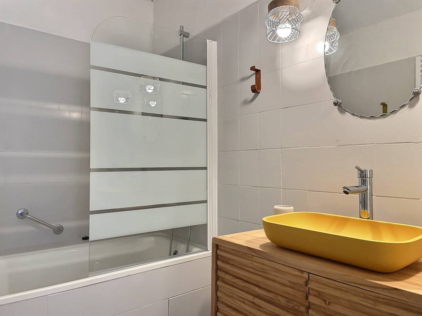 La salle de bain est dotée d’une baignoire. Pour finir, un jardin privatif et terrasse pour profiter au soleil.