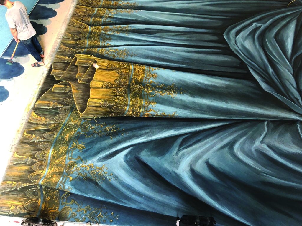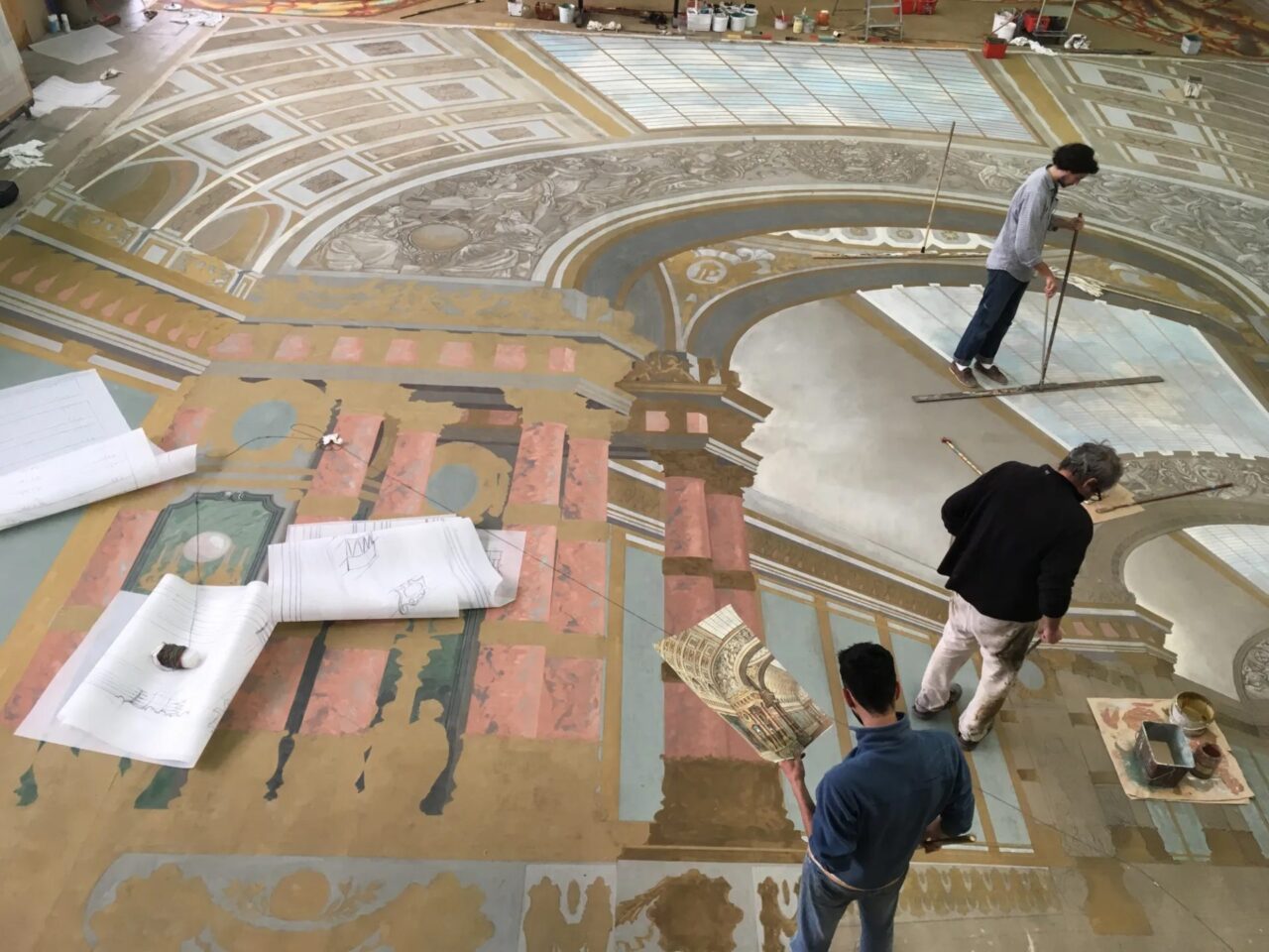 Roland : Cette Académie est un espace de transmission et de formation. Nous y organisons des stages et des ateliers, où nous enseignons les bases du décor peint à partir d’une maquette. L’objectif est de simplifier cette maquette et d’apprendre à réaliser des colonnes, des sculptures en trompe-l’œil et d’autres effets illusionnistes. Nous utilisons des techniques traditionnelles comme la ficelle et le fusain pour tracer les décors.