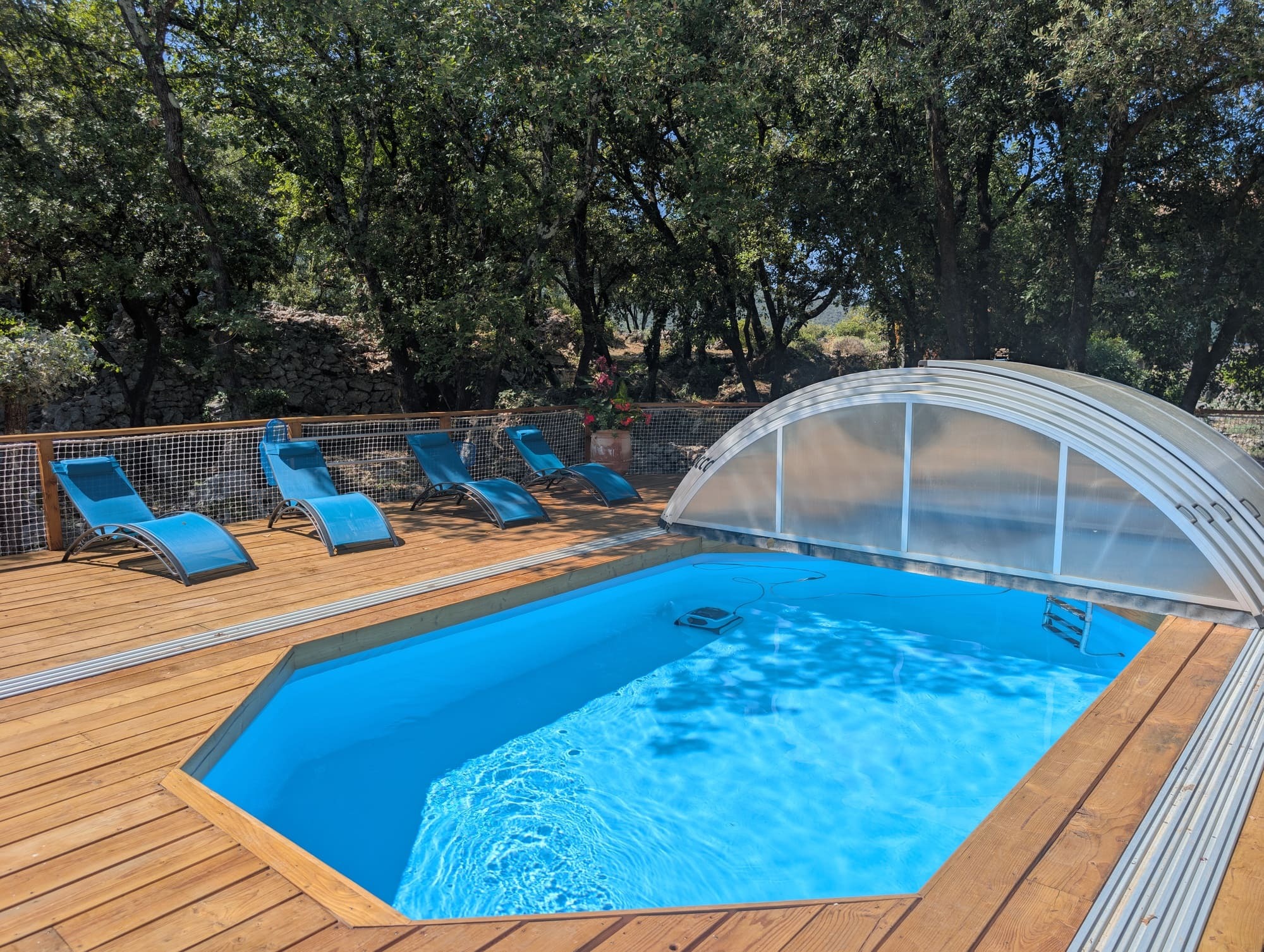 - D’une piscine couverte et chauffée de mai à octobre. Dans ce grand espace, vous trouverez une grande plage de piscine traversée par 4 grands chênes blancs, 4 chaises longues pour vous relaxer et des fleurs partout : un paradis aquatique vous attend.
